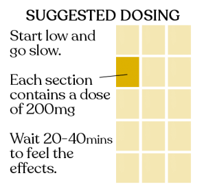 Suggested Dosing: Start low and go slow. Wait 20-40 minutes to feel effects.
